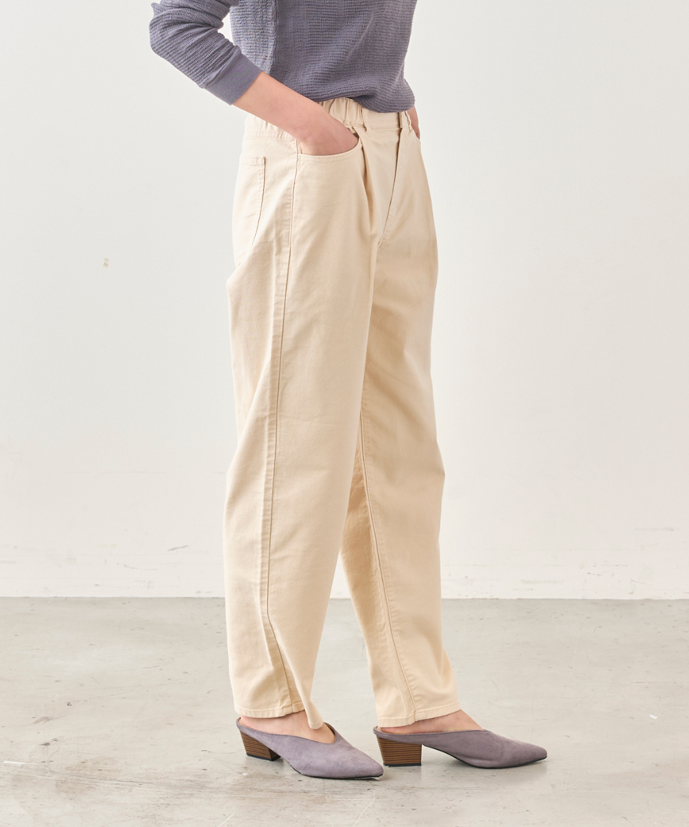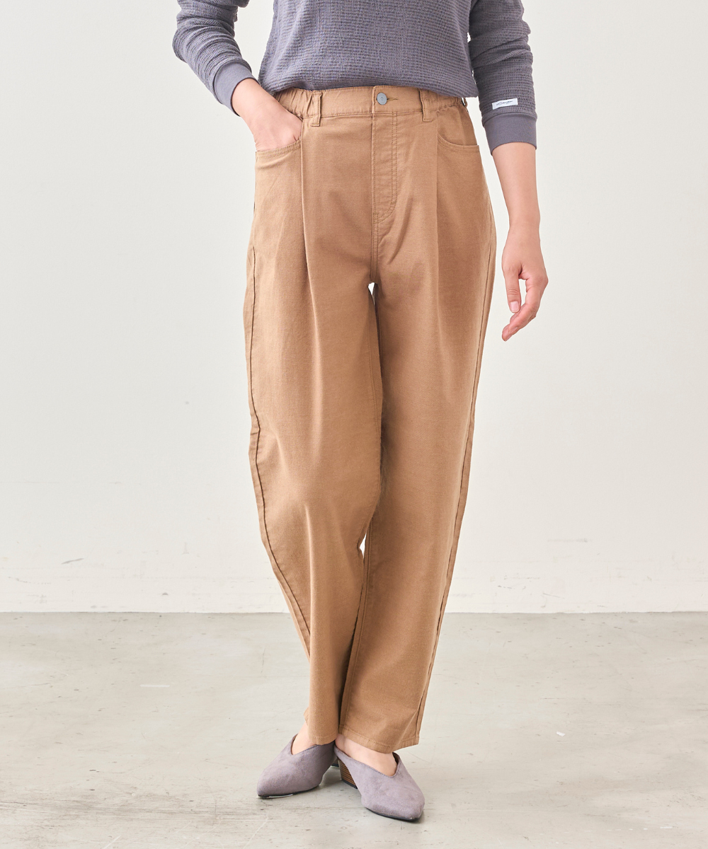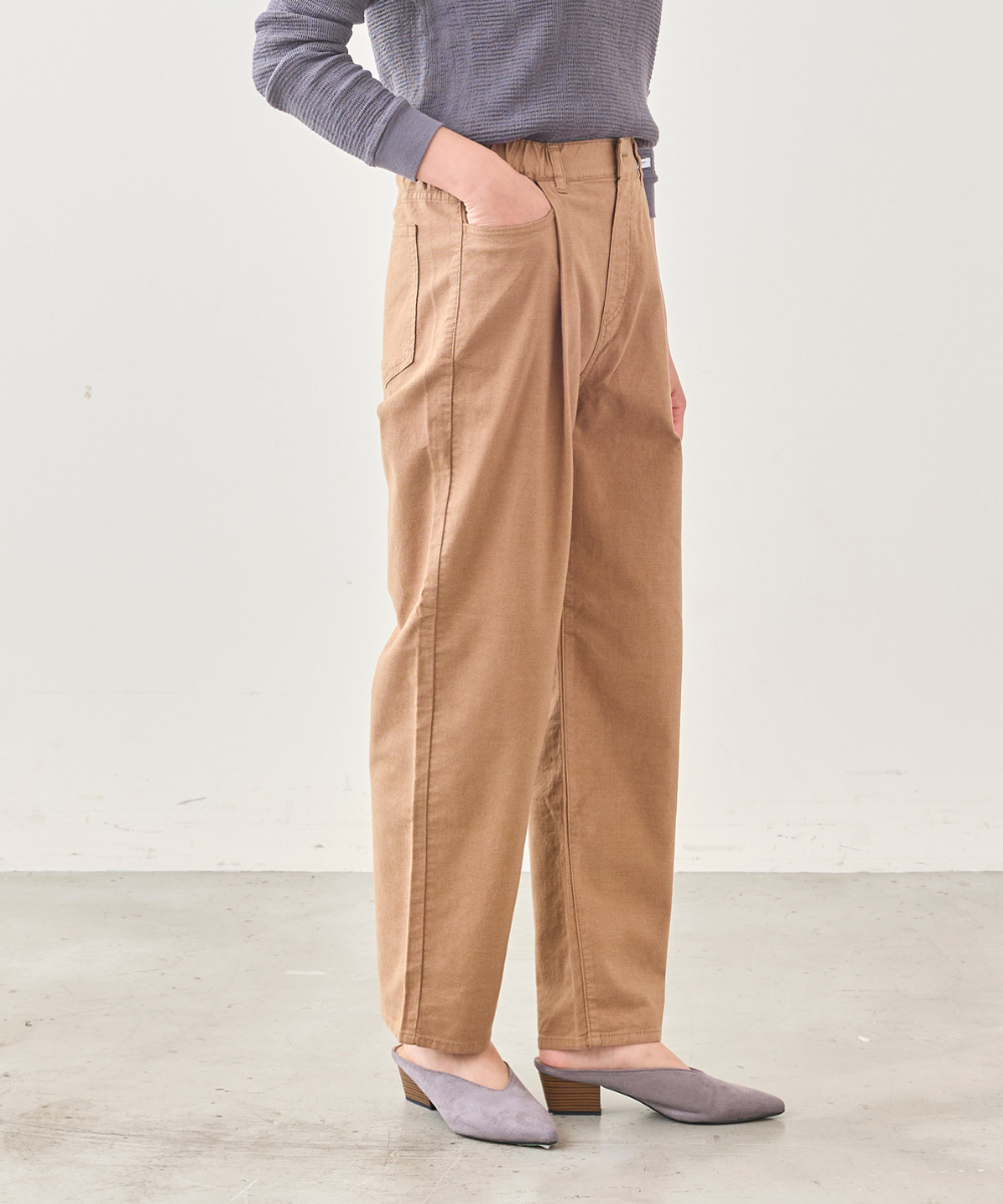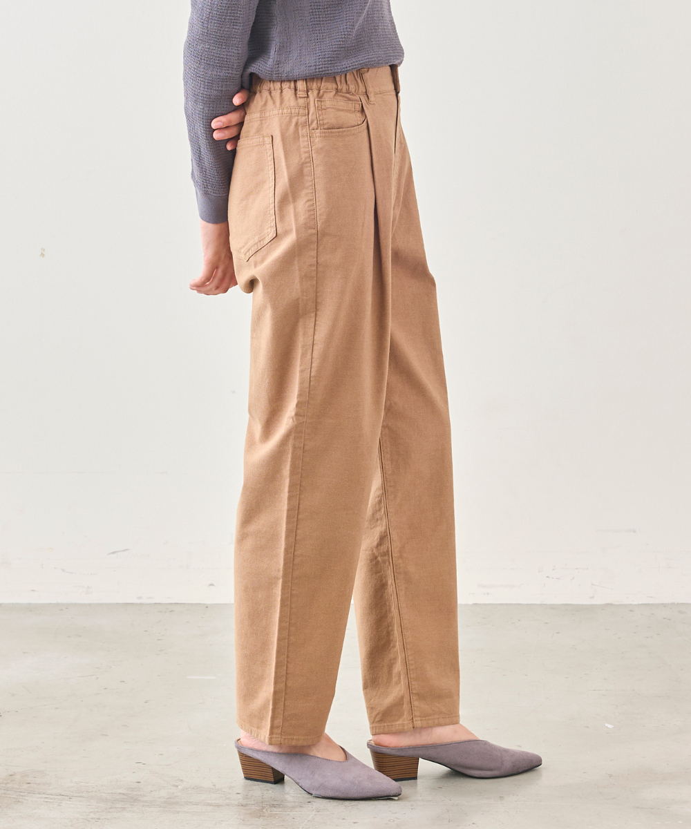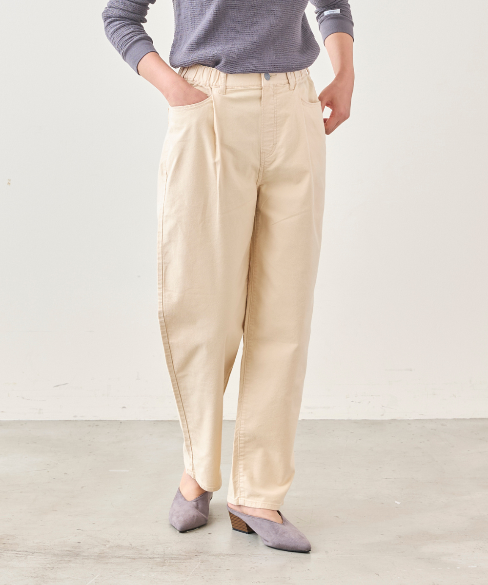 5ポケットのディテールに、フロントタックをとり腰回りにボリュームを持たせ立体的なカーブラインを強調しています。ピーチタッチライクな肌ざわりだけど綿素材。まだまだ残暑が厳しく暑いけれれど秋を感じたい!という方におススメなカラーパンツです。 微ストレッチ性があるので動きにもラクラク。 着回し抜群なベージュとキャメルの2色展開です。