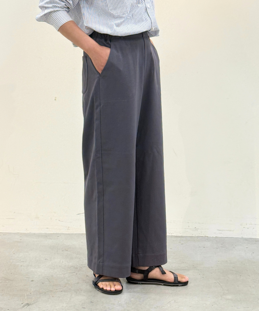 WWOのワイドパンツは、ややハイウエストなデザインで身体のラインを拾わないストンと落ちたストレートシルエット。裾は広がりを抑えることで脚さばきをよくしています。